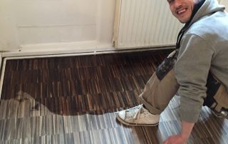 HIer ölt mein Mitarbeiter gerade ein Industrieparkett Hochkantlamelle Räuchereiche mit Naturöl. Man sieht sehr schön was das Öl für eine tolle Farbe hervorbringt.