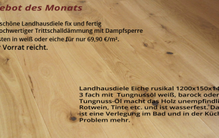 Kurzdiele Landhausdiele TUNG-Nuss geölt LHD Eiche rustikal "Gotik" oxi. weiss TUNG-Nuss fertiggeölt 1200 x 150 x 14 mm, solange der Vorrat reicht. Diese Dielen werden auf eine hochwertige Dämmung auf den fertigen Untergrund schwimmend verlegt. Exklusive Vorarbeiten. Sockelleisten Cube 630 in weiß oder Eiche werden montiert.